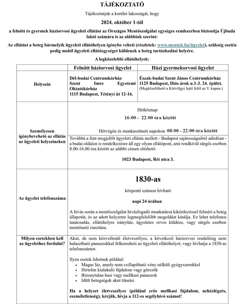 2024 Október 1.-től a felnőtt és gyermek háziorvosi ügyelet ellátást az Országos Mentőszolgálat egységes rendszerben biztosítja Újbuda lakói számára. Az ellátást bármelyik ügyeleti ellátóhelyen igénybe lehet venni (részletek: https://mentok.hu/ugyelet/), szükség esetén pedig mobil ügyeleti ellátóegységet küldenek a beteg tartózkodási helyére.